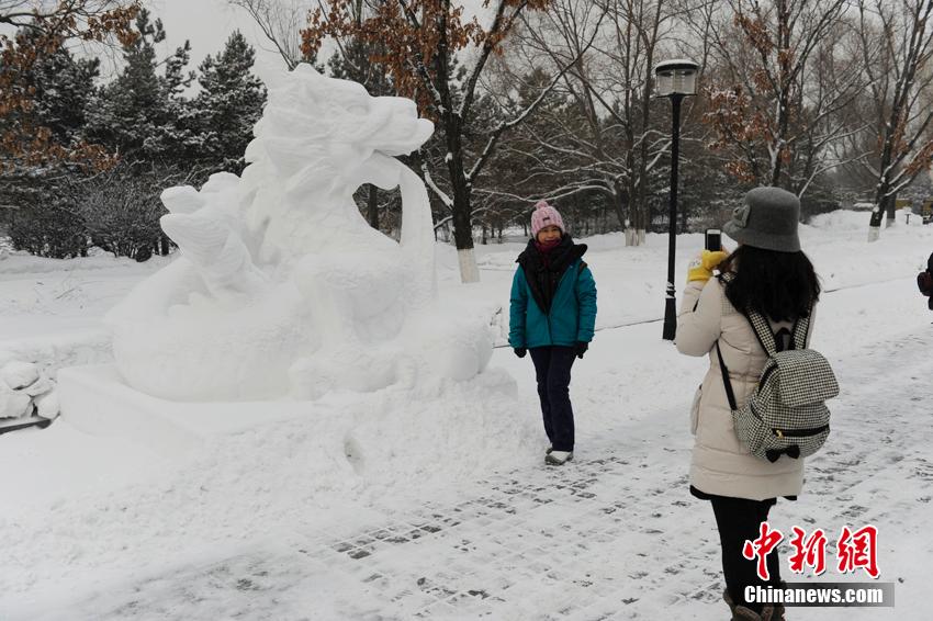 1月20日,来自台湾的游客在长春净月雪世界巨型雪雕前拍照留念。19日起,长春市迎来2014年首场降雪,市民纷纷走出家门赏雪、玩雪。这场雪也终结了长春连续23天无降雪的历史同期观测纪录。张瑶 摄