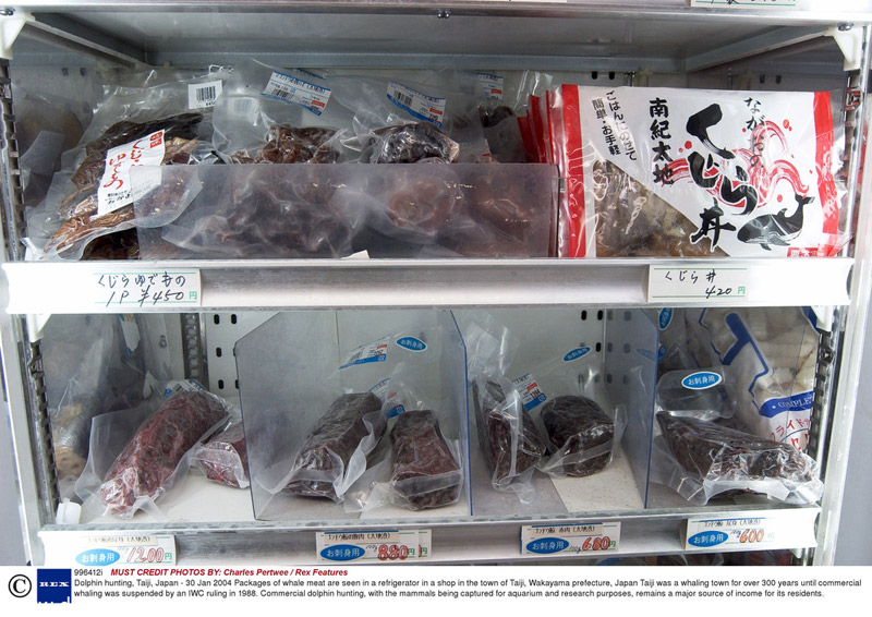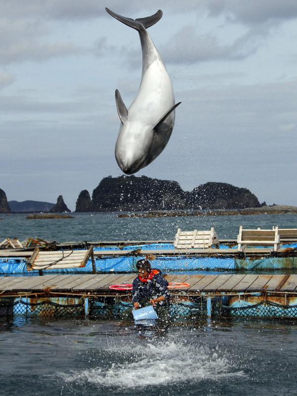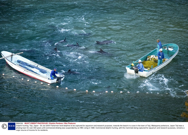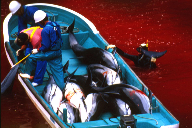 日本南部一个名叫太地町的渔村,是猎杀海豚最凶残的地区。每年秋天,都有成千上万条海豚聚集在太地町附近的海域,时不时会有海豚跃出水面,构成了当地一道极美的风景线。然而,当地渔民却把这些海豚视为一笔极大的财富,一旦他们发现有海豚的踪迹,就会驾驶小船去猎杀,手段极其残忍,甚至连年幼的海豚都不放过。有些母海豚为告知幼海豚有危险,并试图保护它们时,往往会发出极度痛苦的鸣叫。绝望的叫声加上触目惊心的血水,让这一幕显得既凄惨又血腥。长久以来,当地居民早已总结出一套专门捕杀海豚的方法。他们首先将钢铁长管置入海中,并且不断敲打,来迷惑海豚并且使它们受惊。这种做法还能干扰海豚的声纳系统,使它们在海里无法辨视附近的景物。一旦海豚的声纳系统遭到干扰,要想逃脱渔民的捕杀几乎是不可能的事了。随后,渔民会把海豚赶到一些由岩石构建成的凹口内,再将入口用渔网封锁,困在其中的海豚只能任由渔民处置了。不过,渔民们不会马上动手对这些海豚进行屠杀,他们会把被困住的海豚留在狭小的凹口内住一晚上。据说这么做会让海豚肉更加柔软、新鲜和美味。第二天黎明,来自全球各地的贸易商会来挑选适合在水族馆进行表演的海豚,一头特别聪明的海豚可能会被卖到10万英镑。一旦这些贸易商挑选完了合适的对象之后,剩下的海豚们就只能等待被屠杀的命运了!