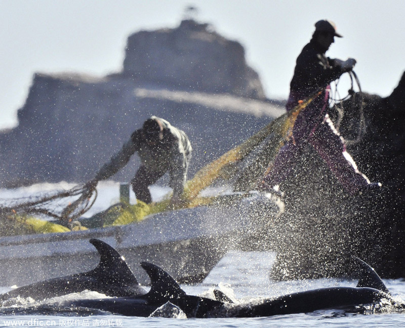 当地时间2010年3月8日,日本太地町,当地渔民大肆捕杀海豚,将海豚视为一笔极大的财富,一旦他们发现有海豚的踪迹,就会驾驶小船去猎杀,手段极其残忍,甚至连年幼的海豚都不放过。有些母海豚为告知幼海豚有危险,并试图保护它们时,往往会发出极度痛苦的鸣叫。绝望的叫声加上触目惊心的血水,让这一幕显得既凄惨又血腥。
