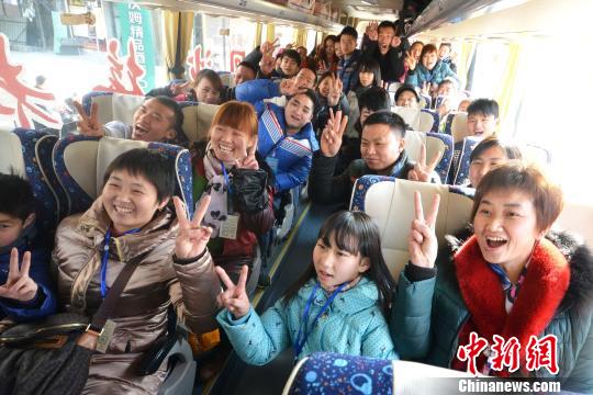 1月21日,“情系贵州老乡爱心之旅活动”的首批100多位老乡在苏州踏上了返乡的免费“爱心大巴”,圆了他们的回家梦。图为苏州开往遵义的“爱心大巴”车上,老乡们很是开心。王思哲 摄
