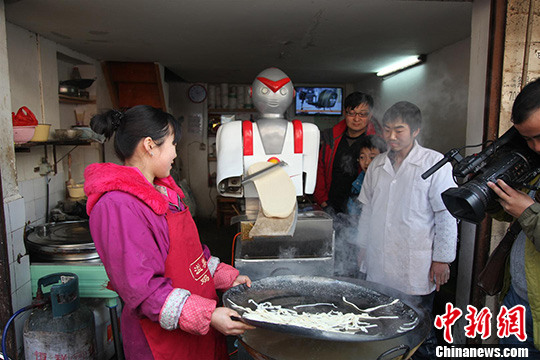 店主对“奥特曼”削面机甚是喜爱。黄余洋 摄