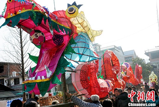 1月20日,在江西省德兴市新岗山镇占才村,村民们刚刚赶制好板凳灯龙头后,就喜不自禁地抬出来拼接成型,现场抬灯演示。卓忠伟 摄