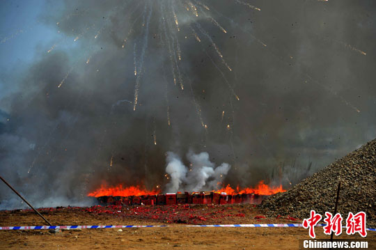 1月20日,福建警方在福州集中销毁2100多件非法烟花爆竹。中新社发 王东明 摄