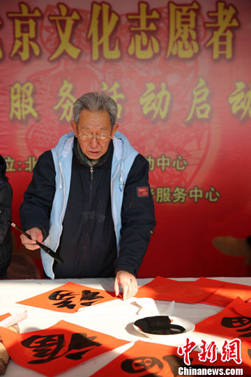 1月22日,一位年长志愿者书写福字。中新社发 韩海丹 摄