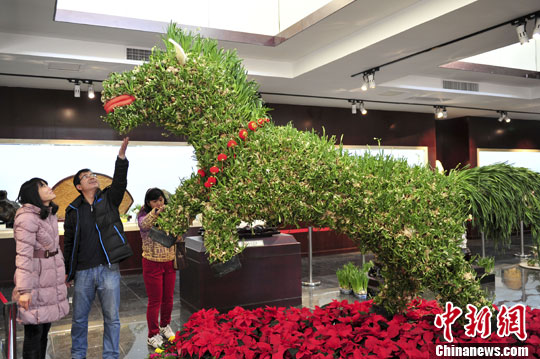 1月22日,一匹用1000头水仙花组成的“骏马”亮相济南大明湖畔,率水仙花“十二生肖”马年迎宾。中新社发 张勇 摄