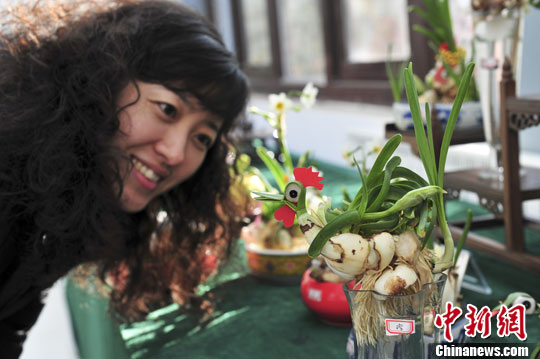 1月22日,游客欣赏水仙花“十二生肖”之“鸡”。当日,一匹用1000头水仙花组成的“骏马”亮相济南大明湖畔,率水仙花“十二生肖”马年迎宾。中新社发 张勇 摄