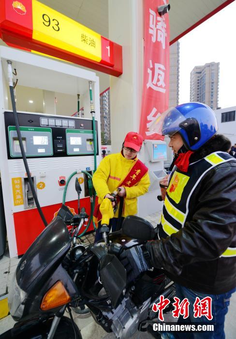 1月23日,福州中石油加油站工作人员为骑摩托返乡的农民工加油。当天,中国石油福建销售公司利用现有网点,为1月23和24日两天内跨省返乡的铁骑提供帮助,特别设计了“铁骑返乡加油卡”,在福建、江西两省43座加油站为铁骑返乡的人们免费加油、免费喝姜汤热茶、免费吃上热饭菜。中新社发 张斌 摄