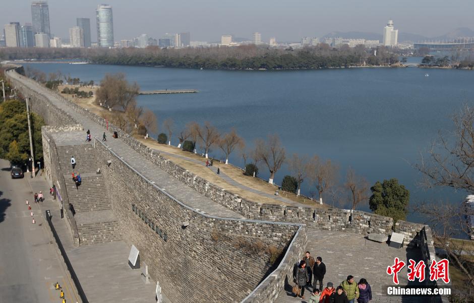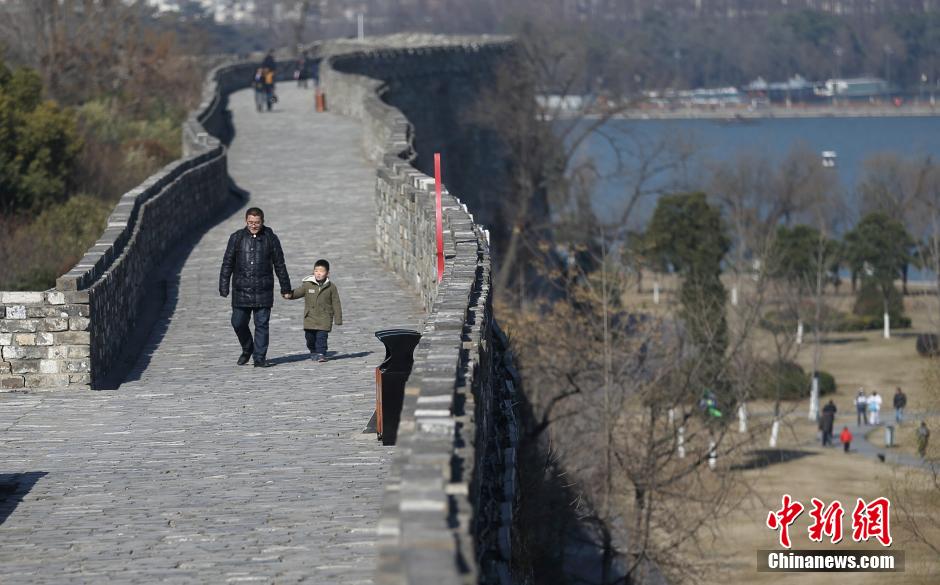 1月22日,游客在南京明城墙解放门至玄武门段游玩。南京市政府日前宣布南京明城墙将于2014年8月之前实现全面开放。届时市民不仅可以站在明城墙上全面感受“一览众山小”,还可以在城墙上进行广场舞、骑自行车等活动。南京明城墙建于1366年至1386年,总长度35余公里,是世界第一大城垣。经过了600多年的风雨侵蚀和人为破坏,明城墙目前尚存25公里长,总长度仍为世界第一,其设计独特,依山水地貌,是南京最具影响和价值的文化遗产。中新社发 泱波 摄