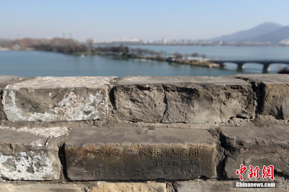 1月22日,南京明城墙城砖上刻着烧制工匠的名字。南京市政府日前宣布南京明城墙将于2014年8月之前实现全面开放。届时市民不仅可以站在明城墙上全面感受“一览众山小”,还可以在城墙上进行广场舞、骑自行车等活动。南京明城墙建于1366年至1386年,总长度35余公里,是世界第一大城垣。经过了600多年的风雨侵蚀和人为破坏,明城墙目前尚存25公里长,总长度仍为世界第一,其设计独特,依山水地貌,是南京最具影响和价值的文化遗产。中新社发 泱波 摄