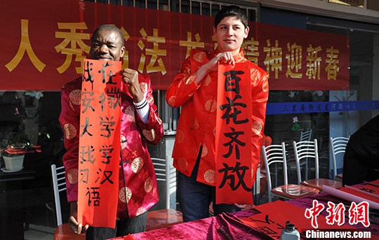 1月22日,两位身在安徽的留学生义务为居民写春联,他们的书法被众多居民争相抢要。当日,来自智利的留学生何承志和中非留学生普林斯身着唐装在安徽省合肥龙河路社区为居民写春联,感受中国年味。中新社发 韩苏原 摄