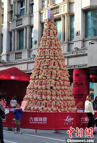 1月22日,一座3米多高、挂满了小熊布娃娃并贴满了“福”字的高塔,立在厦门中山路,吸引许多游人合影留念。中新社发 吕明 摄