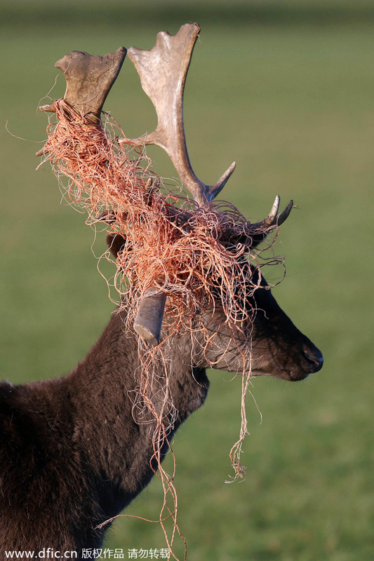 当地时间2014年1月21日,爱尔兰都柏林,公园内,摄影师Fran Veale拍摄到一只雄鹿头顶“红发”的酷样。据摄影师猜测,该雄鹿应该是不小心撞到围栏,才缠上这些红色的细状物。估计要等到4月,等鹿角自然脱落才能摆脱这些“红发”了吧,但看雄鹿的神情,倒是满不在乎,悠然自得,似乎对自己的新造型还挺满意的呢。