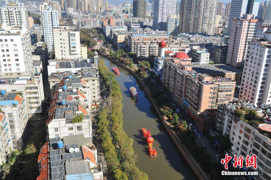 1月24日,多个巨型彩船行进在昆明母亲河——盘龙江的水面上。据了解,这些彩船是为了迎接马年新节而设置的,将在春节期间统一点亮。中新社发 任东 摄