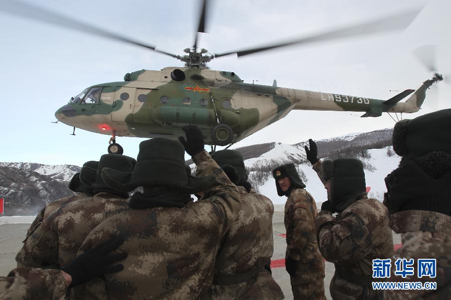 红山嘴边防连官兵迎接运送年货的直升机(1月21日摄)。