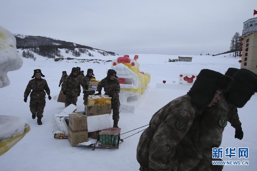 红山嘴边防连的官兵们在搬运年货(1月21日摄)。