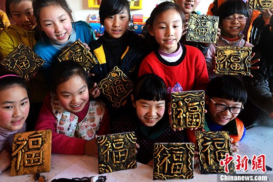 1月23日,农历马年临近,来自苏州公益组织“蝴蝶妈妈”读书会的10多个小朋友在该市桂花公益坊活动室内,用油土和颜料在KT板上创造出了一个个个性“福”字,浑身散发着土豪金,很是惹眼,给即将到来的农历新年增添了几分热闹。