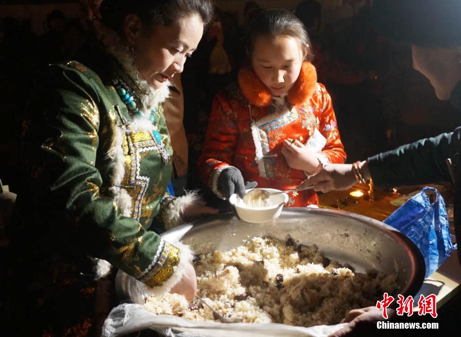 1月23日夜里,甘肃肃北蒙古族自治县广大民众身穿节日盛装,相聚在新城北区广场,举行了“肃北蒙古族自治县首届祭火仪式”。图为分发贡品八宝饭。乌仁花 摄