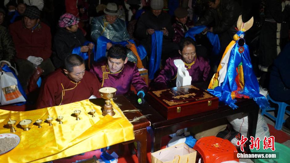1月23日夜里,甘肃肃北蒙古族自治县广大民众身穿节日盛装,相聚在新城北区广场,举行了“肃北蒙古族自治县首届祭火仪式”。图为僧人诵经祈福。乌仁花 摄