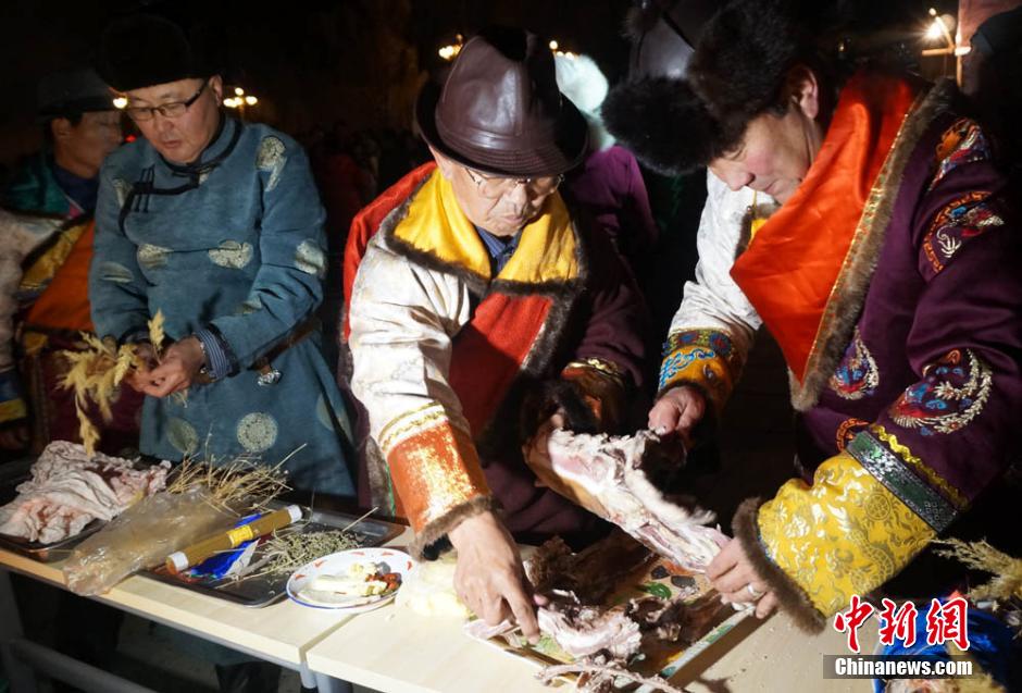 1月23日夜里,甘肃肃北蒙古族自治县广大民众身穿节日盛装,相聚在新城北区广场,举行了“肃北蒙古族自治县首届祭火仪式”。图为做祭品。乌仁花 摄