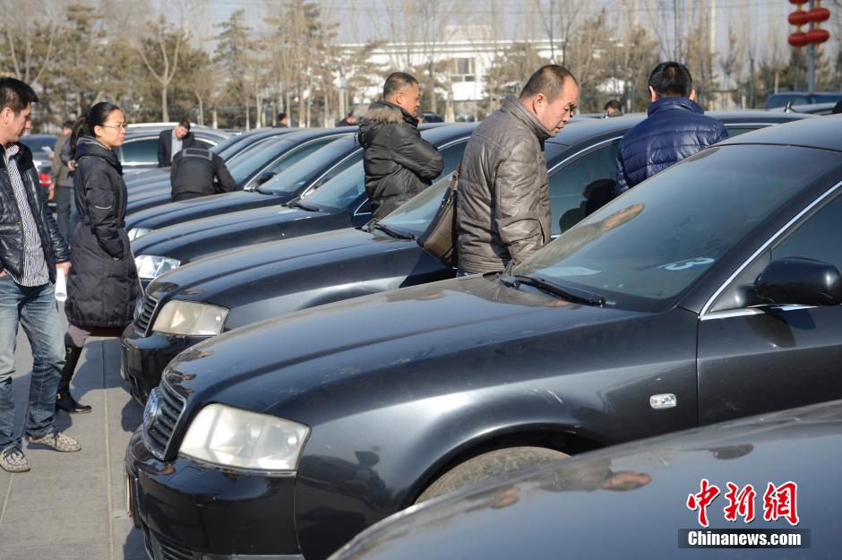 1月26日,竞拍后,买家观看车况。当日,内蒙古呼和浩特首批19辆超标公务车公开拍卖,19辆车全部为奥迪汽车。最高成交价为一台已行驶7万4千多公里的FV7201TFCVTG奥迪车,起拍价17万,成交价28.1万元;最低成交价为一台已行驶34万多公里的A6L1.8TAT奥迪车,起拍价2万,成交价6.6万元。中新社发 刘文华 摄