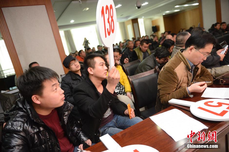 1月26日,拍卖会现场,竞拍买家举牌竞拍。当日,内蒙古呼和浩特首批19辆超标公务车公开拍卖,19辆车全部为奥迪汽车。最高成交价为一台已行驶7万4千多公里的FV7201TFCVTG奥迪车,起拍价17万,成交价28.1万元;最低成交价为一台已行驶34万多公里的A6L1.8TAT奥迪车,起拍价2万,成交价6.6万元。中新社发 刘文华 摄