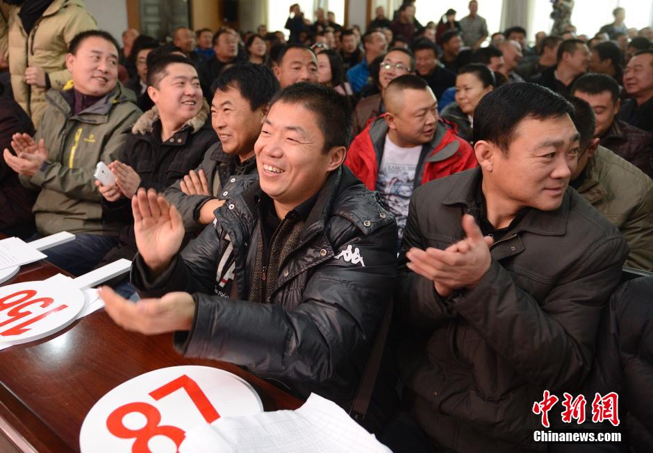 1月26日,拍卖会现场,一位竞拍买家多次举牌,引起其他买家掌声。当日,内蒙古呼和浩特首批19辆超标公务车公开拍卖,19辆车全部为奥迪汽车。最高成交价为一台已行驶7万4千多公里的FV7201TFCVTG奥迪车,起拍价17万,成交价28.1万元;最低成交价为一台已行驶34万多公里的A6L1.8TAT奥迪车,起拍价2万,成交价6.6万元。中新社发 刘文华 摄