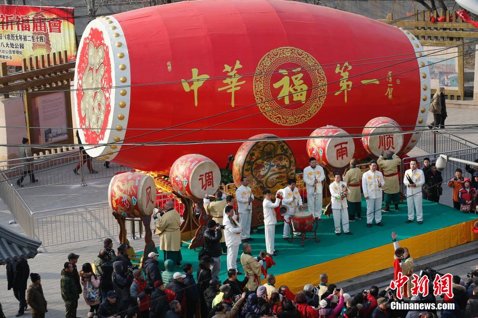 1月26日,北京八大处新春祈福庙会举行大彩排,由400人组成12档花会集结亮相。八大处公园专门定制了的巨大的腰鼓,长10米,高6米,摆放在八大处的山门前。正月初一至十五,游客可以在八大处新春祈福庙会体验百年前原汁原味的老北京庙会文化。中新社发 盛佳鹏 摄