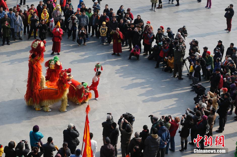 1月26日,北京八大处新春祈福庙会举行大彩排,由400人组成12档花会集结亮相。八大处公园专门定制了的巨大的腰鼓,长10米,高6米,摆放在八大处的山门前。正月初一至十五,游客可以在八大处新春祈福庙会体验百年前原汁原味的老北京庙会文化。中新社发 盛佳鹏 摄