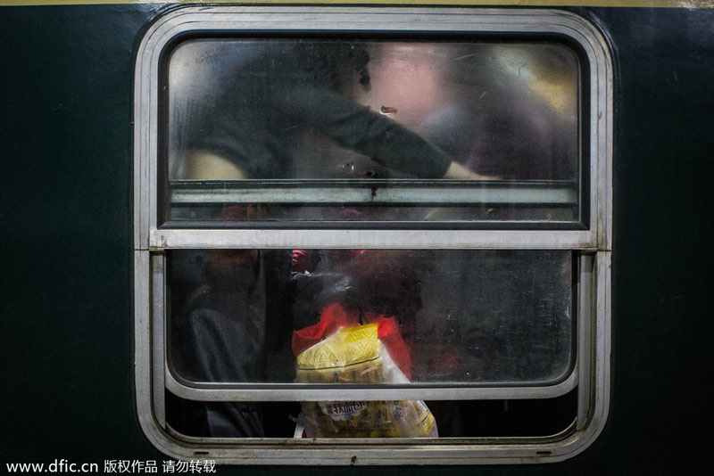 2014年1月25日晚,深圳西站,一列开往四川方向的临客,拥挤的车厢。