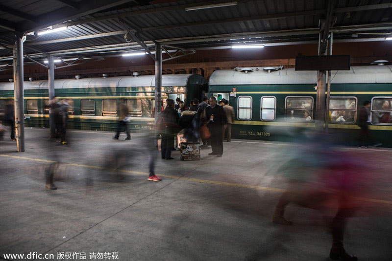 2014年1月26日晚,深圳火车站1号站台,一列开往襄阳方向的临客,归心似箭的旅客们在站台上奔走,赶着上车。