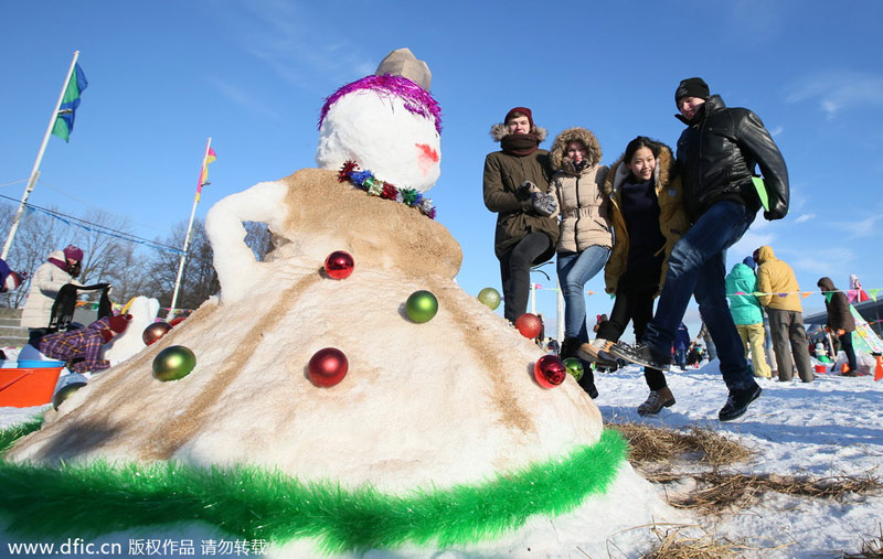 当地时间2014年1月25日,俄罗斯莫斯科,趣味堆雪人比赛举行,各种造型独特的雪人作品令人大开眼界。
