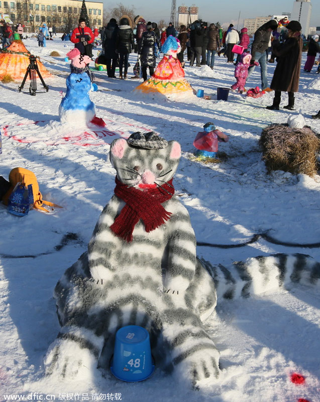 当地时间2014年1月25日,俄罗斯莫斯科,趣味堆雪人比赛举行,各种造型独特的雪人作品令人大开眼界。