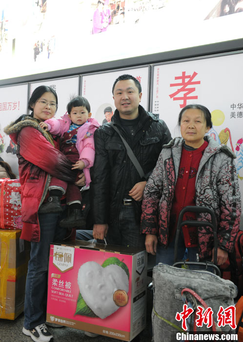 这一家四口人即将踏上返回家乡四川德阳的旅途。儿子在北京从事会计工作已经十年有余,其间娶妻生子,建立一个新的家庭。临近春节,他带着妻儿和来京探亲的母亲一起回乡,与父亲、弟弟一家团聚。他手中拎着一箱被子,礼物虽“轻”、情意重。图/张越 文/张龙云