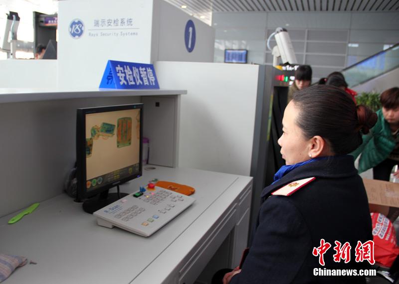 1月27日,2014年节前春运客流逼近高峰,旅客们带着大包小包的行李踏上回家的旅程。随着浙江宁波火车站内客流量逐渐增大,大量的行李让安检仪也变得繁忙。不过不断进入安检通道的各类行李,在安检机的电子屏幕上形成了一幅幅浓缩着期盼和向往的归家图,这些图画所抒写和记录的是春运的历史和变迁。图为安检仪工作人员,每天检查上万件行李。林波 摄