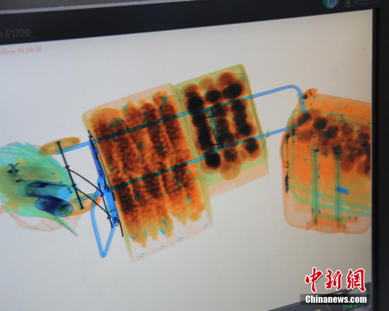 1月27日,2014年节前春运客流逼近高峰,旅客们带着大包小包的行李踏上回家的旅程。随着浙江宁波火车站内客流量逐渐增大,大量的行李让安检仪也变得繁忙。不过不断进入安检通道的各类行李,在安检机的电子屏幕上形成了一幅幅浓缩着期盼和向往的归家图,这些图画所抒写和记录的是春运的历史和变迁。图为安检仪下的“苹果”。林波 摄