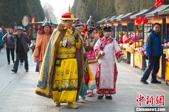 1月28日,巡游至买卖街的“皇帝”掏出手机拍照留念。当日,北京圆明园公园第五届皇家庙会买卖街正式开街。中新社发 崔楠 摄