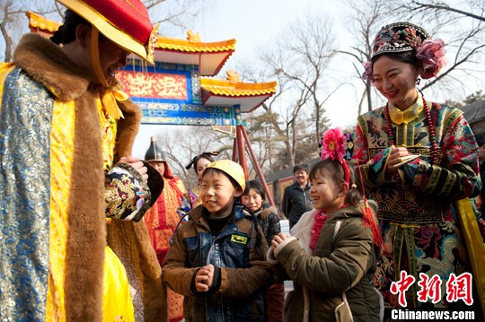 1月28日,被“赐戴”圆帽和头饰的小朋友向“皇帝”与“妃子”作揖拜年。中新社发 崔楠 摄
