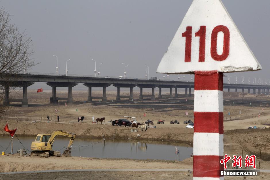 1月28日,河南郑州黄河花园口段,不远处裸露着的河床已经成了民众遛马放牧的场所。郑州白庙、柿园两个地表水厂调蓄池水位在一周内迅速降至警戒水位以下。近日,黄河花园口段水流量进一步降为220m3/s。白庙水厂花园口取水泵站调蓄池水位降至90.51米,为历史最低值,水厂被迫降压供水。导致京广铁路以东、陇海路以北、中州大道以西、北四环以南附近区域供水“吃紧”,当地开始采用挖掘机对长约三公里的支流引水河道进行24小时不间断拓宽疏通,尽可能增加取水量。有专家指出入冬以来北方地区的持续干旱天气是黄河水少的直接原因,如果此现象持续下去,尤其是在开春后冬小麦返青需要大量用水时还没有改观,将不利于今年中国夏粮增产。中新社发 王中举 摄