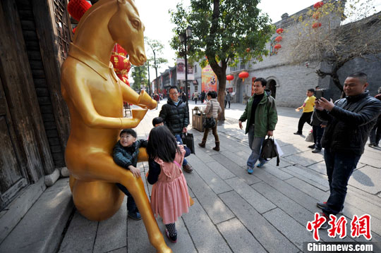 1月28日,福州古街一“坐马”吸人眼球。马年春节临近,各种马造型装饰品亮相福州大街小巷。中新社发 王东明 摄