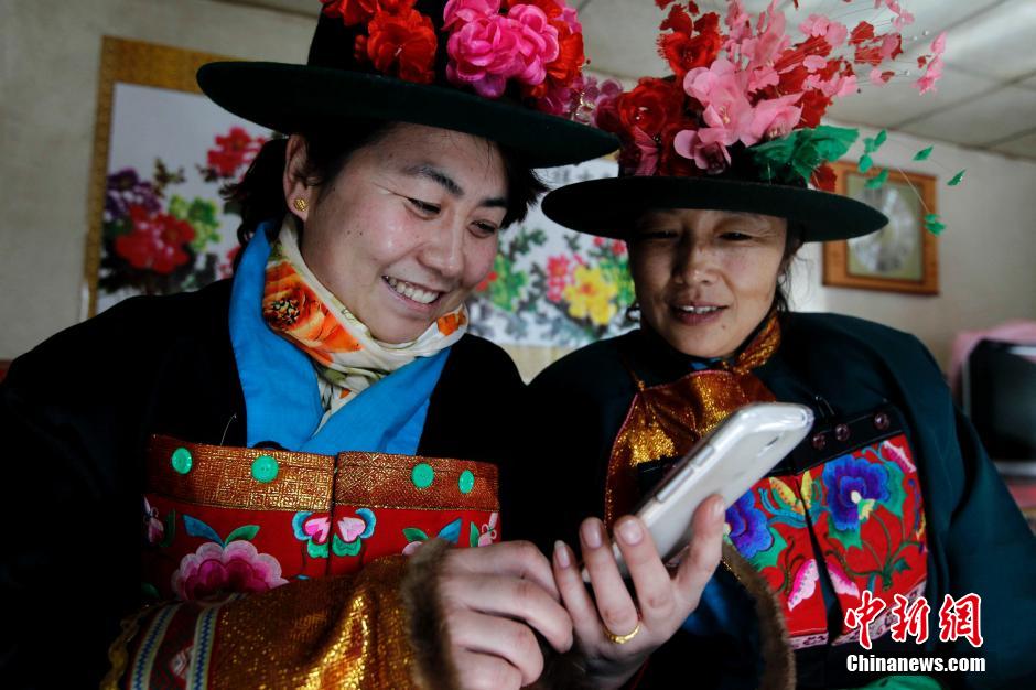 大年三十,向化乡立树尔村两名身着节日盛装的土族妇女正在发微信。青海省西宁市大通县向化藏族乡曾是唐朝时期形成的一个藏族部落,迁自拉萨。现在这里聚居着汉、藏、蒙、土等多个民族2000余户人家,其中50%以上是藏族,各民族相互通婚,我中有你,你中有我,彼此友爱,相互尊重。中新社发 胡友军 摄