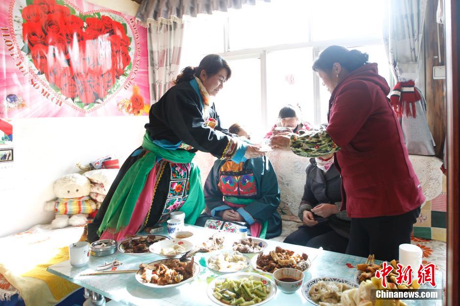 大年三十,向化乡立树尔村两名身着节日盛装的土族妇女正在发微信。青海省西宁市大通县向化藏族乡曾是唐朝时期形成的一个藏族部落,迁自拉萨。现在这里聚居着汉、藏、蒙、土等多个民族2000余户人家,其中50%以上是藏族,各民族相互通婚,我中有你,你中有我,彼此友爱,相互尊重。中新社发 胡友军 摄