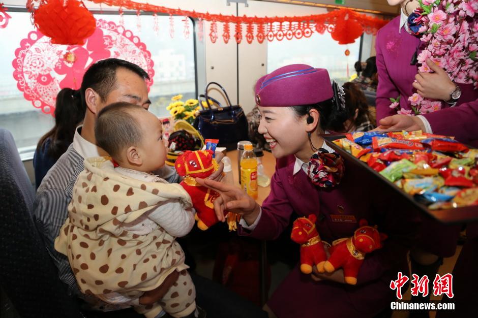 1月30日除夕,成都铁路局成都客运段的各趟列车装扮出浓浓的新春喜庆气息,同时在列车上开展互动活动,让旅客在喜庆、快乐的旅行氛围中“马上回家”。图为成都——上海的Z124次列车餐车服务员在车窗上贴上了“马到平安”的窗花。朱琳琳 摄