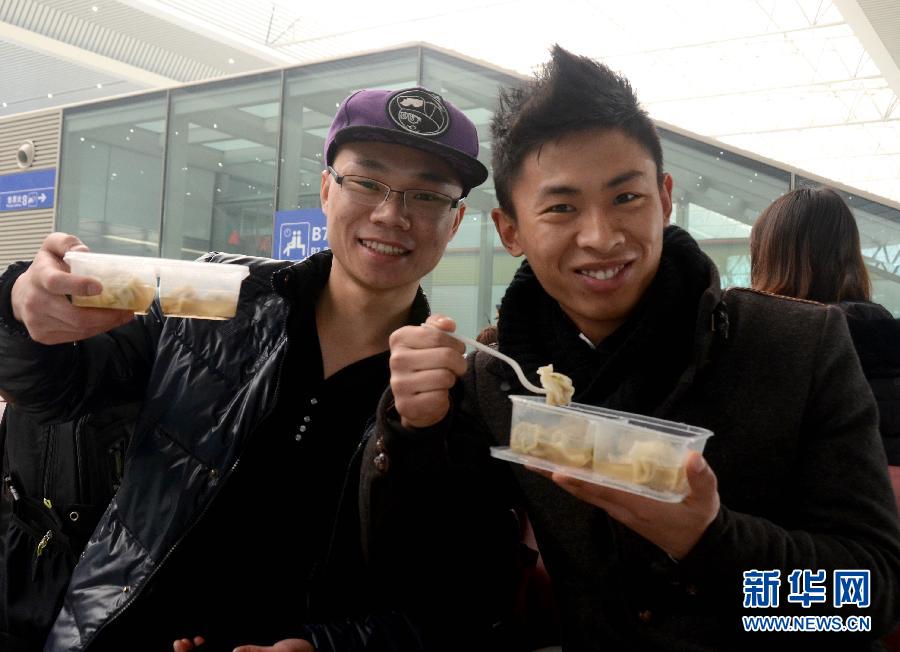2014年1月30日,郑州火车东站的工作人员将准备好的饺子端给一名小旅客。当日是农历除夕,郑州火车东站的工作人员准备了1000余份热气腾腾的饺子在车站里免费发放,让旅客们在旅途中也能感受到浓浓的年味。 新华社记者 李安摄