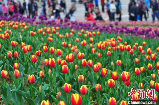广西柳州园博园的20万株郁金香竞相开放,五彩缤纷花朵引来众多市民观赏、拍照。周潇男 摄