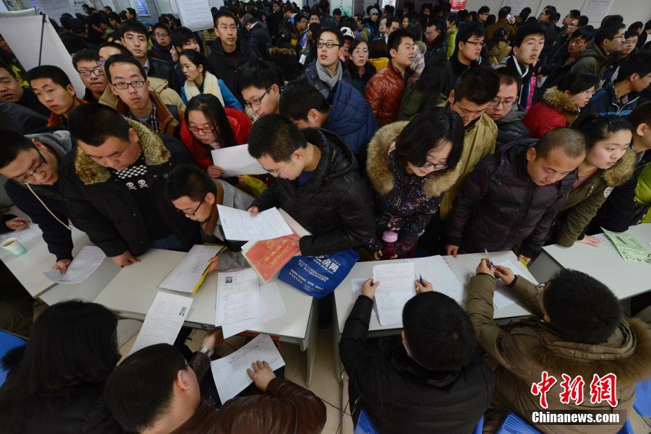 2月7日,山西太原人才市场富士康太原工业园区招聘处,聚集了大批应届大学毕业生前来应聘。当日,山西太原举办马年首场大型招聘会,近万名求职者挤进招聘会现场。中新社发 韦亮 摄