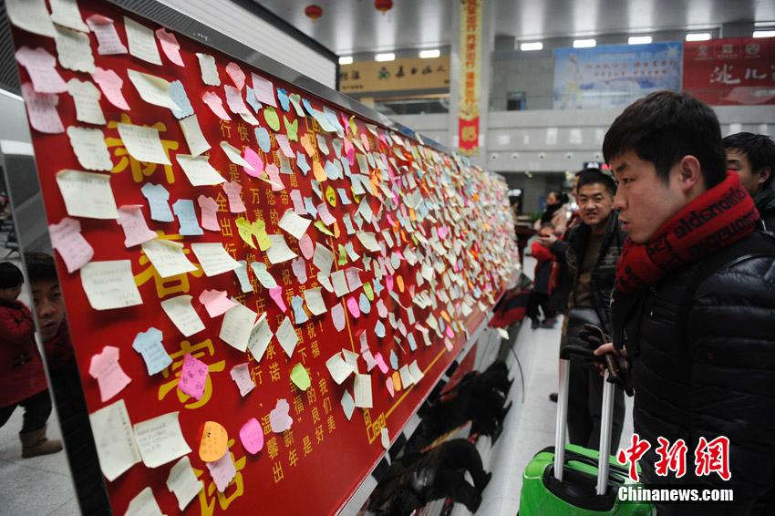 2月7日,在长春市火车站候车大厅中央,一面近十米长的“祝福墙”上,贴满了过往旅客的新春祝福,为忙碌的候车大厅增添了一份温馨和欢乐。张瑶 摄