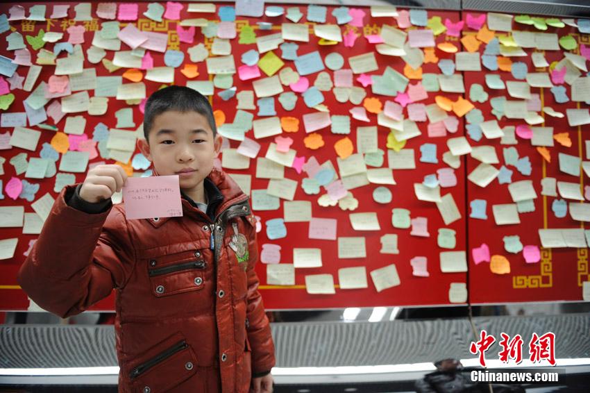 2月7日,在长春市火车站候车大厅中央,一面近十米长的“祝福墙”上,贴满了过往旅客的新春祝福,为忙碌的候车大厅增添了一份温馨和欢乐。张瑶 摄
