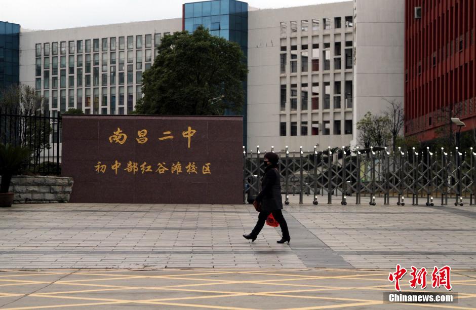 2月7日,一位南昌市民从南昌二中初中部红谷滩小区门口走过。当日,南昌市教育局发出“关于中小学、幼儿园推迟一周开学时间的紧急通知”。通知指出,根据气象部门天气预报,近期南昌将有一次大风降温雨雪天气过程,为确保中小学、幼儿园师生出行安全,决定将新学期开学时间由原定的2月10日推迟为2月17日。中新社发 姜涛 摄