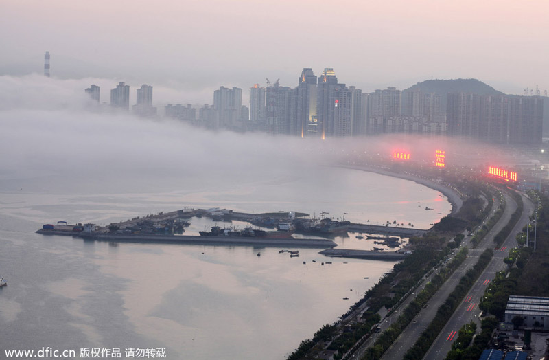 2014年2月6号傍晚,厦门惊现神奇的平流雾,犹如仙境,十分壮观。平流雾(advection fog)是暖湿空气移到较冷的陆地或水面时,因下部冷却而形成的雾。通常发生在冬季,持续时间一般较长,范围大,雾较浓,厚度较大,有时可达几百米。