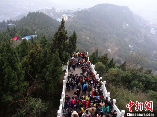 图为参加四川省达州市“元九登高节”活动的市民冒雨沿着山路前进。邓良奎 摄